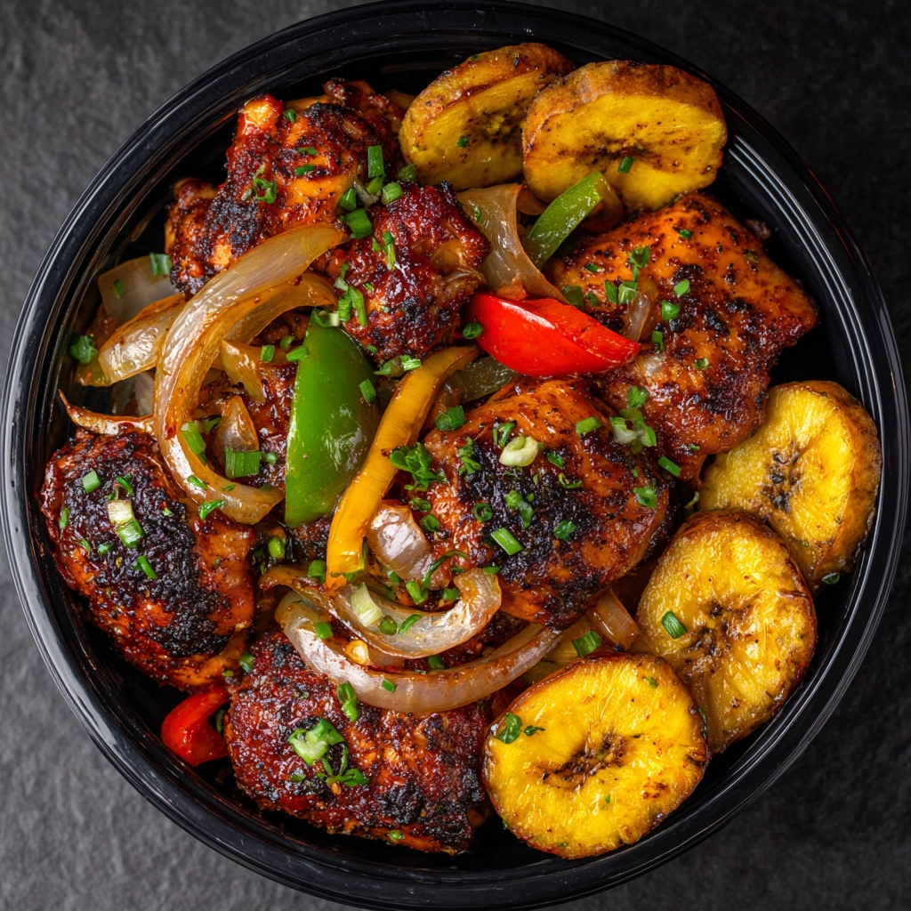 Poulet Directeur Général, avec poivron, légumes et bananes plantain.