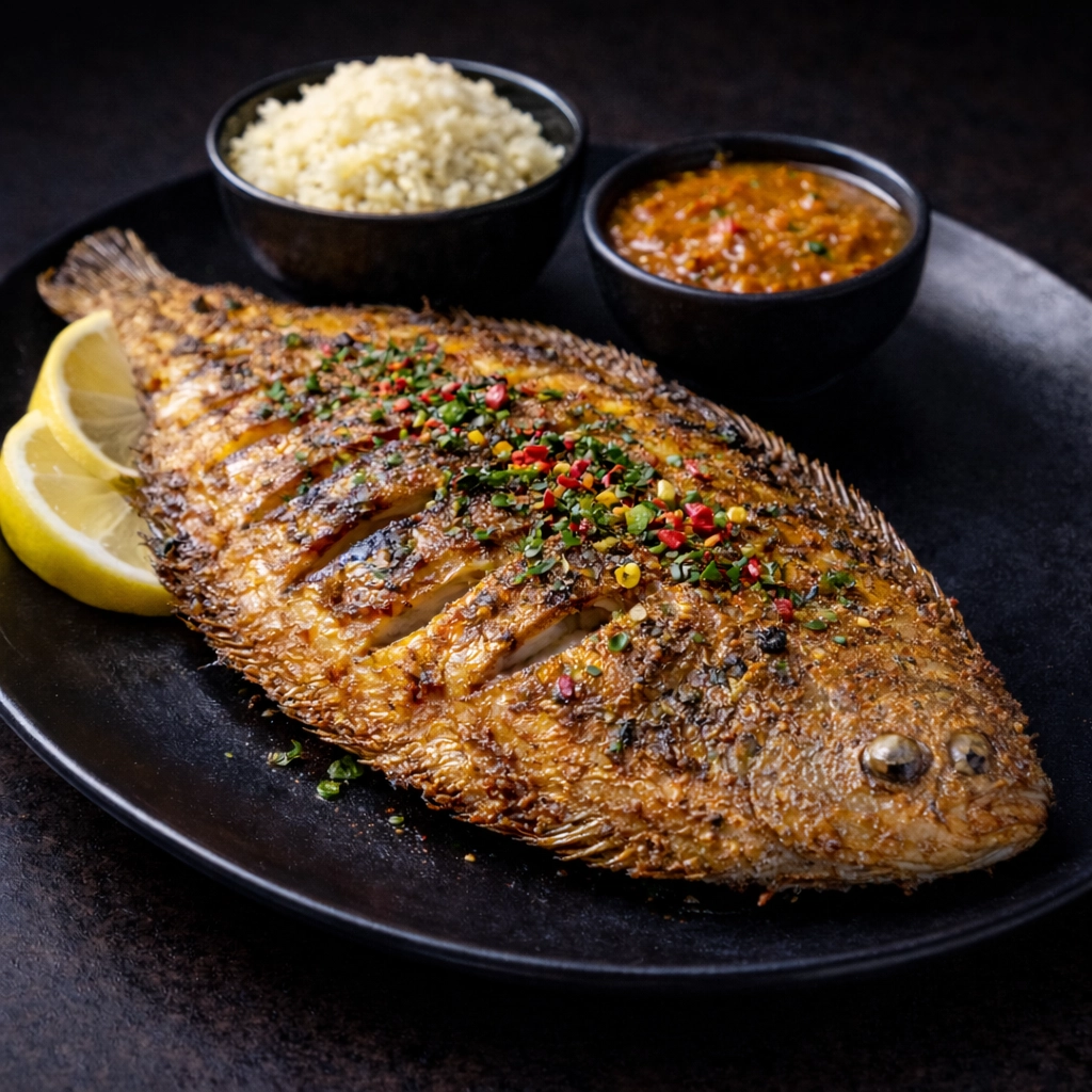 Prix selon taille : 25–50 €. Poisson sol braisé ou frit.